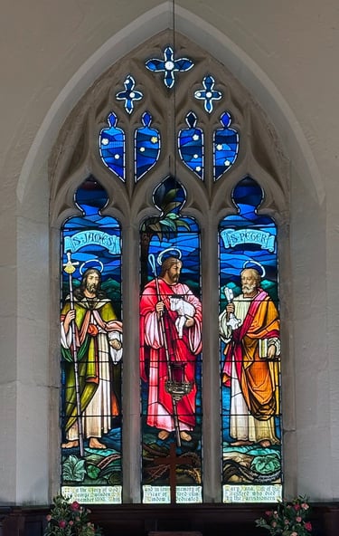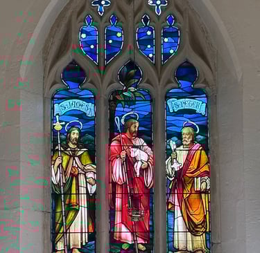 The Stained Glass window in St James Church, with it's link to St Peter's Church in Besford. (Click image to enlarge).